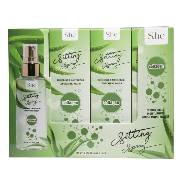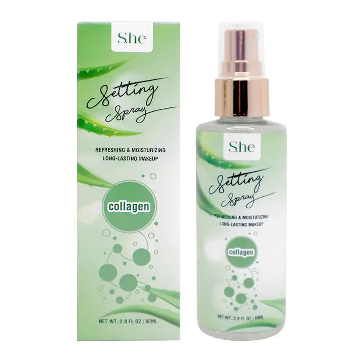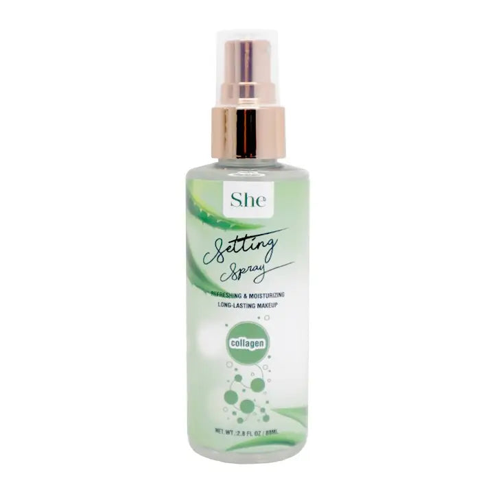 Collagen Setting Spray. Infused with Aloe Vera left extract and collagen to refresh and moisturize skin. Helps set and keep makeup in place for a long lasting wear.